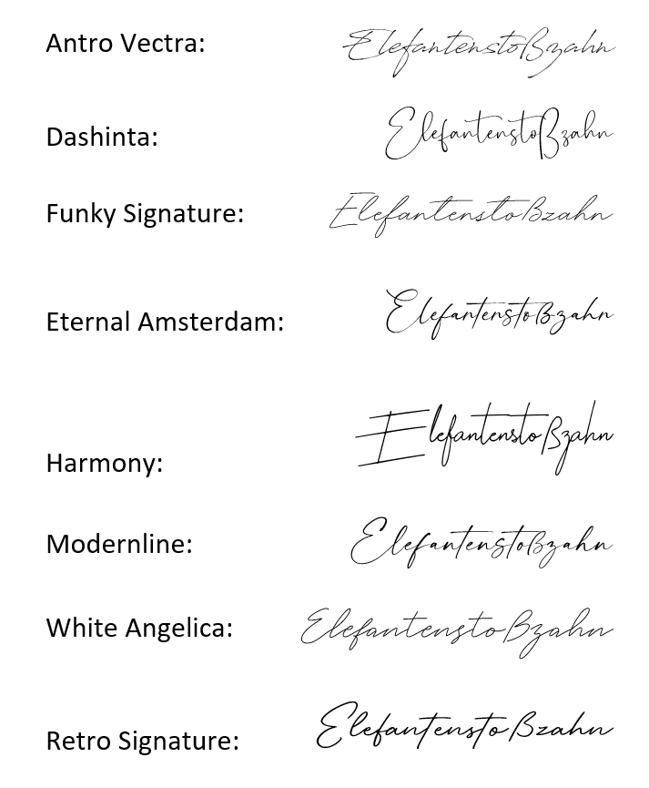 Ihr habt hier schon so viele tolle Tipps gegeben, vielleicht könnt ihr mir auch bei meinem "Problemchen" behilflich sein. Ich such eine Schriftart für das Wort "Elefantenstoßzahn". Habe meine - schon recht große Sammlung - durchgeschaut und auch etliche Fontseiten durchforstet. Doch anstatt fündig zu werden, wurde ich immer konfuser. Das Problem ist auch, dass ein "ß" drin sein muss. Bei meinem Beispiel habe ich schon etwas getrickst . Das Wort ist "Signature December" und das ß "Gloss and Bloom". Aber so richtig gefallen tut mir das nicht Danke und lieben Gruß Pascalinah