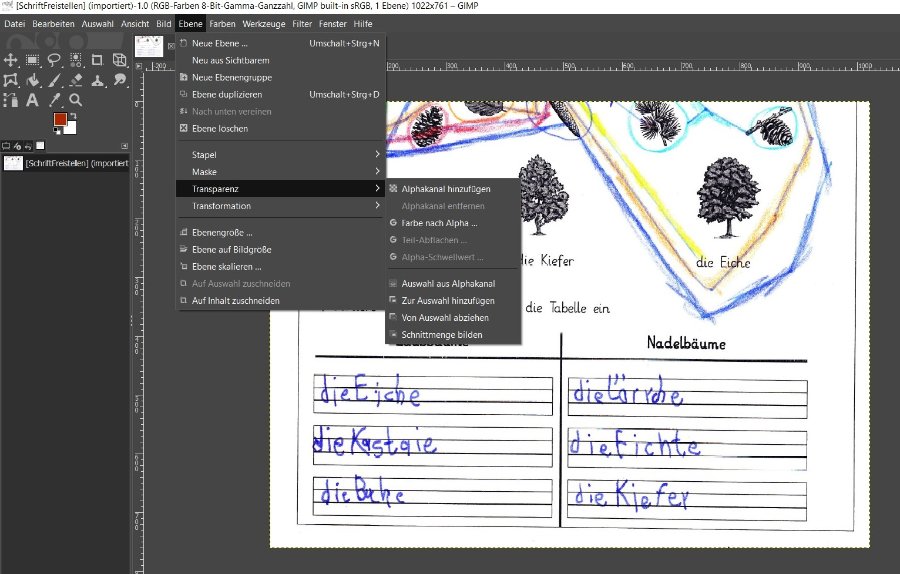 LG und dankeScreenshot (4).png Hast Du bei der freigestellten Schrift den Farbton geändert? Ich würde ihn original belassen. Wenn ich Schrift freistellen will, gehe ich bei Gimp so vor: Datei mit Gimp öffnen Auswahl: Ebene --> Transparenz --> Alphakanal hinzufügen ---> In den Farbbereich klicken, welcher transparent werden soll --> bestätigen Auswahl: Datei ---> Exportieren nach ---> Name geben und Dateityp .png wählen. Letzteres ist wichtig, da sonst die Transparenz nicht gespeichert wird. Mit Exportieren bestätigen. Fertig. Insgesamt finde ich die Farbharmonie auf der Doppelseite nicht so schön abgestimmt. Das lila will mit dem braun/beige in meinen Augen nicht so recht zusammenpassen. Da würde ich andere Farbtöne wählen. Liebe Grüße