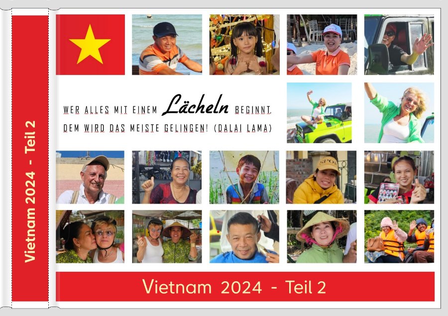 bin jetzt schon beim ca. 20. Entwurf für das Cover für ein Vietnam-Buch. Hab mich für eine Compilation lächelnder vietnamesischer Menschen (und zwei Münchnern Habe hier drei Entwürfe. Und bevor ich einen Würfel hole, wollte ich euch fragen, was ihr besser findet. Mit gefällt von der Optik der erste Wurf am Besten, jedoch befürchte ich, dass das viele Rot zu sehr von der Lächeln-Hauptbotschaft ablenkt. Was meint ihr? Vielen Dank im Voraus für euer Feedback! PS: Beim zweiten und dritten Entwurf habe ich rechts oben ein „You make me smile“-Clipart von CEWE verwendet. Habe dann versucht, in dem schönen Dalai-Lama-Zitat „Wer alles mit einem Lächeln beginnt ...“ nachzubilden. Naja, mit eher mäßigem Erfolg. Kennt vielleicht jemand die Schriftart von dem Wort „smile“ in dem Clipart? Re: Cover für VietnamMir gefällt das 2. Beispiel am Besten. Das Clipart und der Spruch lockern das Ganze auf. Beim 1. Beispiel ist mir zu viel rot.