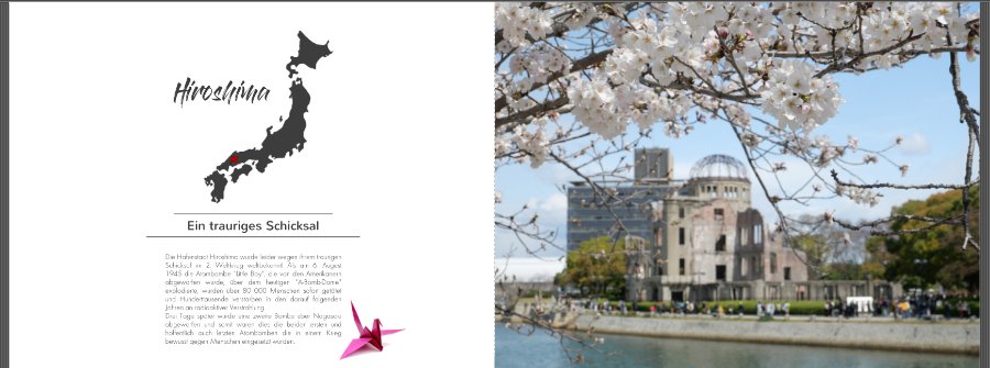 Nun zu meiner neuen Frage D:roll: : Zu jeder Stadt, habe ich eine Doppelseite mit Japankarte, kurzem Text und einem großen Bild gemacht. Würdet ihr das große Bild vollflächig machen, oder findet ihr es etwas kleiner mit Rahmen besser???