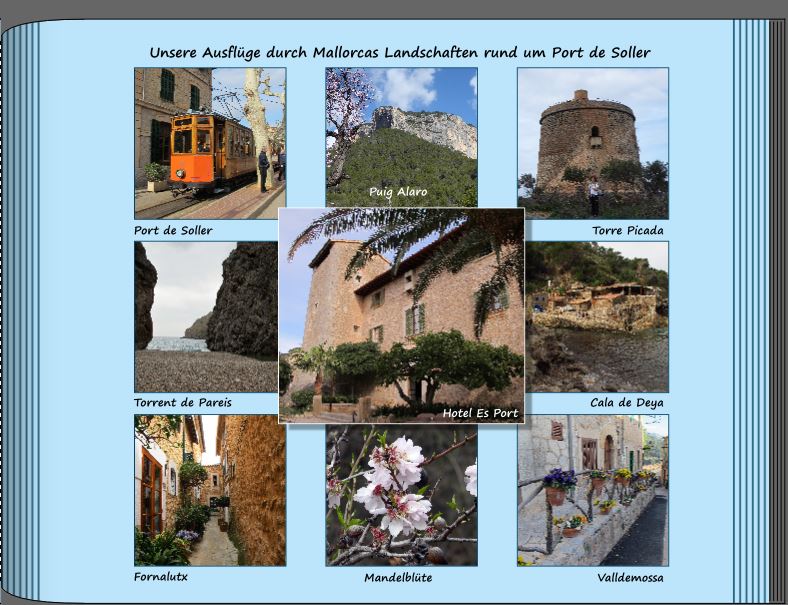 Ein kleiner Optimierungsvorschlag: Die rechtsbündigen Texte sollten rechts bündig mit dem Foto sein. (Textrahmen markieren und mit den Pfeiltasten solange tippen, bis es passt.) Mir kommt spontan eine Idee: Da viele Fotos Sandstein zeigen - wie wäre es, wenn Du mit dem Farbpicker einen hellen Sandton herausholst und den Hintergrund statt in Blau sandfarben einfärbst? Und die Rahmen im selben aber dunkleren Farbton? Bitte guck doch nach den Schreibweisen: Cala Deià Port de Sóller Puig de Alaró Lieber Gruß, pitty