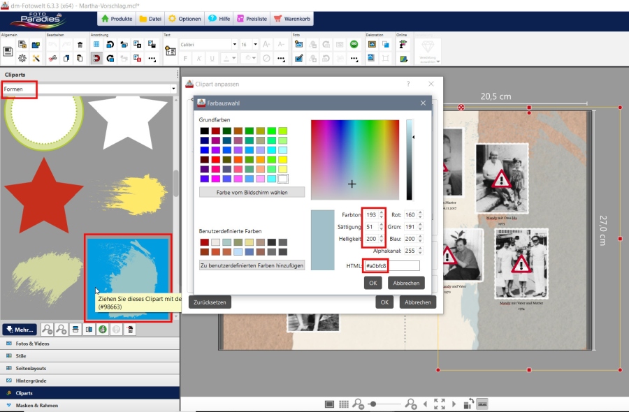 ja natürlich darfst du den übernehmen Damit du nicht soviel suchen musst hier die verwendeten Elemente: Der Hintergrund ist die Nr. #8420 aus der Kategorie Jahrbuch. Rechts habe ich noch das Clipart #98633 aus Formen drüber gelegt. Ich habe das Clipart ein bisschen blauer gemacht, weil ich es so harmonischer fand. Die Farbe ist nun #a0bfc8. Und ich habe alle Fotos in der Fotoschau entsättigt, damit sie den gleichen Farbton haben. liebe Grüße