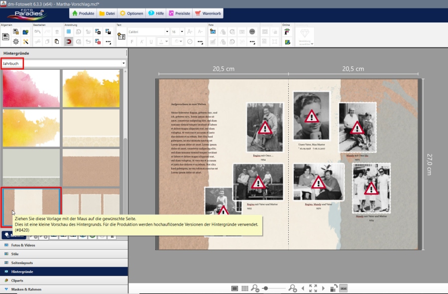 Pitty, meinst du damit den Hintergrund? Wenn ja, den bekomme ich so nicht geändert, weil es ein eigener Hintergrund von Cewe ist..... Die rechte Banderole entweder etwas breiter machen, dass sie zwischen den beiden oberen Fotos sitzt, oder schmaler, dass sie zwischen den beiden unteren Fotos sitzt. Den Abstand im Bund im Summe so breit machen, dass er ungefähr 1,5x so breit ist wie die (noch gleich auszurichtenden) Abstände der Bilder rechts. Alle Menschen sind Gehirnbesitzer, aber nicht alle Menschen sind Gehirnbenutzer.