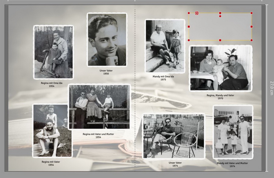 Mir geht es ebenso und ich stelle mir dieselben Fragen.Auch wenn Ihr wisst, wer die Personen auf den Fotos sind, erscheint es mir unpersönlich, nicht alle beim Namen zu nennen - und zwar bei jedem Foto. Auch bei Eurem Vater! Deine Gestaltung schafft es nicht, die Unklarheiten aufzuklären. Zum Layout meine Gedanken: