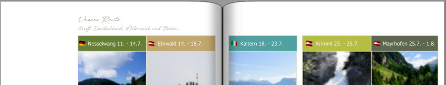 Sehr gute Idee mit nur der Linie....Ich könnte ja auch, auf der ersten Seite diesen dicken Balken (mit Ehrwald) lassen und die nächsten Seiten nur die Linien machen?!Dann wird es auch schwierig mit meiner Idee. Da gefällt mir deine Idee mit den Flaggen auf jeden Fall besser. Edit: Sieht gut aus, Unsere Route vielleicht noch einen Tick runter? Und für die entsprechenden Seiten könntest du dann vielleicht nur eine Linie in der entsprechenden Farbe oben platzieren, ist weniger raumgreifend als ein dicker Balken. So ähnlich mache ich das gerade im Jahrbuch. Da du die Ortsangaben im Inhaltsverzeichnis hast, finde ich, dass du die dann auch nicht wiederholen musst. Re: Überschrift ja oder neinEylah2013 hat geschrieben:
