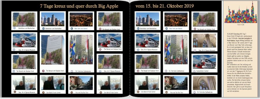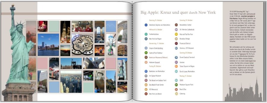 Danke Fokussy, Deine Anregungen für die linke Seite werde ich beherzigen und das Clipart auf der rechten Seite weglassen. da ist schon mächtig was los auf der Doppelseite. Wenn du das grundsätzlich so beibehalten willst, würde ich die Fotos schmaler machen, so dass alle auf eine Seite passen. Auch wenn du Verläufe scheinbar sehr liebst Den Text würde ich um die Freiheitsstatue herum schreiben (einfach mit Leerzeichen Platz schaffen). Aber wenn du die Fotos eurer Stationen auf die rechte Seite bringen kannst, bleibt ja auch mehr Platz für den Text. Das Clipart auf der rechten Seite auf jeden Fall wegnehmen, da die Seite ja insgesamt schon sehr voll ist. Ich hoffe, Du hast nicht meinetwegen eine Nachtschicht eingelegt. Fokussy hat geschrieben: Ihr ward sicher mehrere Tage in NY, da würde sich evtl. auch ein Layout in dieser Art anbieten. Danke Fokussy für diesen Tipp. Dies ist wirklich eine sehr gelungene und interessante Seite eines Inhaltsverzeichnis. Werde ich mir auf jeden Fall merken, selbst wenn ich es für dieses FB wahrscheinlich nicht anwende.(Von Starliner, X-Mas-Special 2018) https://www.cewe-community.com/forum/vi ... 30#p134616 000-Inhalt-NY.jpg .. [/quote] Fokussy hat geschrieben: