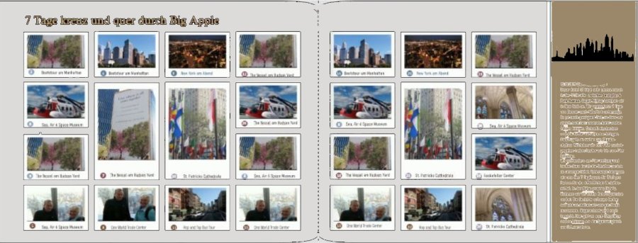 Re: New York -Fragen zur GestaltungJa wunderbar, aber den Hintergrund links noch hinter die Fotos setzen und die Ränder der Fotos würde ich eher weiß machen, aber das ist natürlich Geschmackssache!