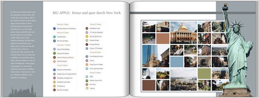Re: New York -Fragen zur GestaltungIch finde die Überschriftgröße zu groß, die zieht sich über die ganze Seite, ich denke, das wirkt im Buch erschlagend. Und ich würde sie zentriert anordnen.Welche Fontgröße hast du gewählt?