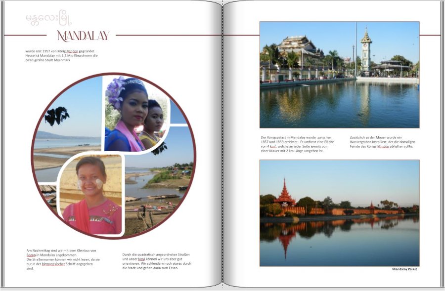 Ich gebe einfach auch nochmal meinen Senf dazu. Ich persönlich finde die birmesische Schrift so wunderschön, dass ich sie auf jeden Fall irgendwo einfügen würde, die Kringelschrfit ist einfach soooo dekorativ. Vielelicht auch noch größer und klein darunten die Übersetzung (in der Brotschrift, vielleicht aber im selben Farmton, einfach damit man weiß, was die Kringel bedeuten). Ich finde die linke Bastelei schön, manchmal muss man einfach auch spielen dürfen. Ist zwar eigentlich auch nicht meine Sache, aber es passt zu Myanmar. Mir gefällt allerdings der weiße Innenrahmen nicht, wirkt etwas hart und im unteren Portrait ist eh viel weiß. Probiere evtl. auch mal eines der Portraits zu spiegeln, damit sie in unterschiedliche Richtungen blicken. Außerdem sind die beiden Landschaften etwas nichtssagend. Die Brücke (Sagain?) liegt im Nebel (wie fast immer LG Monika Re: passt diese Schriftart zu Myanmar?urlaubsfan hat geschrieben: Wir haben hier schon so viele schöne Seiten zusammen gestaltet, die vielen Usern gefallen und die auch umgesetzt werden (sieht man an den Kundenbeispielen)