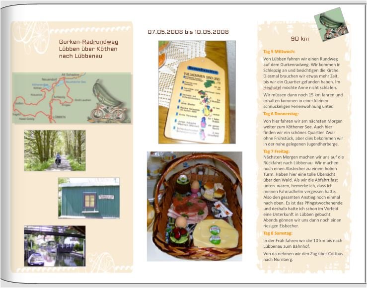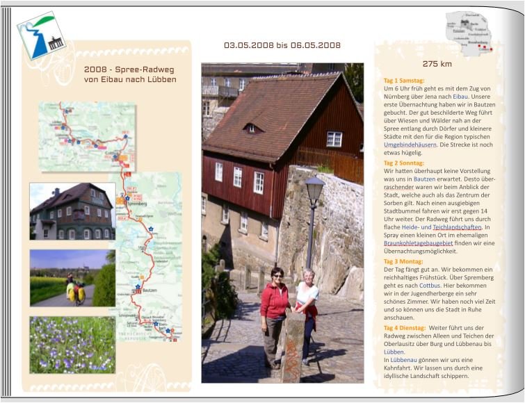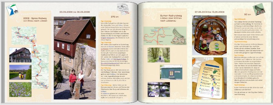 Die Anordnung der mittleren Bilder auf der rechten Seite würde ich ein klein wenig verändern. Damit ich mich nicht in Erklärungen verzettele, habe ich mal etwas gebastelt. Ich habe die Größenverhältnisse an die umliegenden Elemente angepasst, siehe: Lieber Gruß Traumfänger Re: Radtouren Buch Eure MeinungAlso doppelt wollte ich die rechte Seite nicht senden. Ja, den Schatten auf dem oberen Teil des Spreewaldes habe ich übersehen.