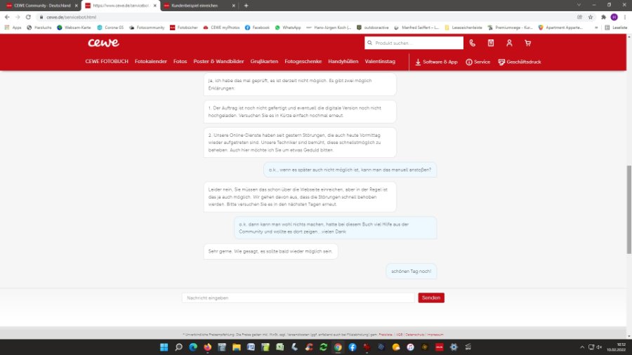 du hast recht, im Normalfall sollte es recht schnell möglich sein, ein Kundenbeispiel einzureichen. Wir bitten dich hier einmal bis zum Erhalt des Exemplars abzuwarten und es dann noch einmal zu versuchen. Klappt es dann immer noch nicht, würden wir den Vorgang einmal an die Fachabteilung weiterleiten. Grundsätzlich ist das einreichen so lange möglich, wie die Daten bei uns gespeichert sind. Dies sind in der Regel bis zu 6 Wochen nach der Bestellung. Daher bin ich guter Dinge, dass wir den Fehler rechtzeitig beheben können und dein Kundebeispiel veröffentlicht werden kann. Viele Grüße Timo Re: derzeit in ArbeitCEWEianer hat geschrieben: Hallo Harzluchs,