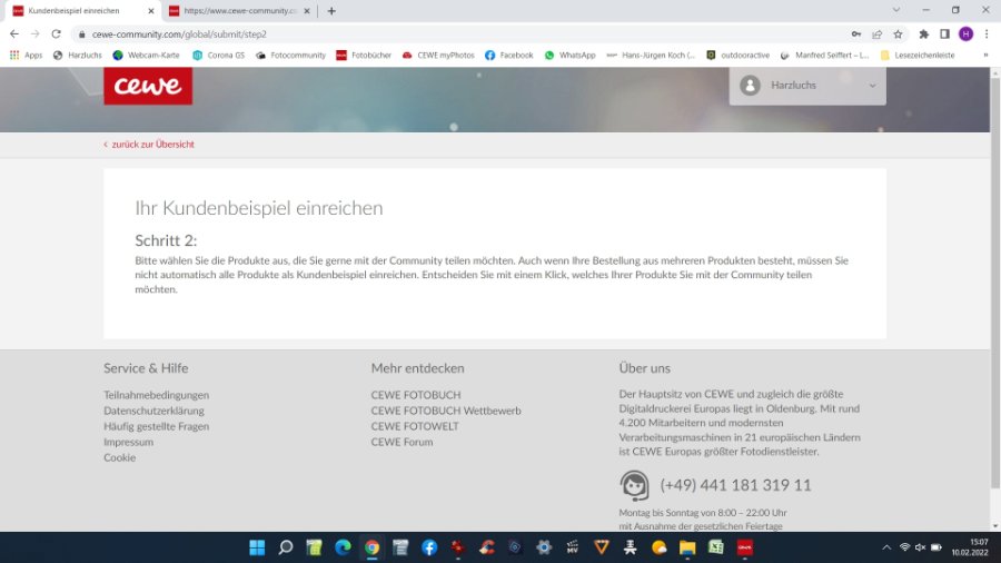 es tut uns leid, dass du dein CEWE FOTOBUCH nicht als Kundenbeispiel hochladen kannst. Damit wir dein Anliegen prüfen können, benötigen wir die betroffene Auftragsnummer und eine genaue Vorstellung davon, an welcher Stelle es nicht mehr weiter geht. Vielleicht kannst du uns einmal einen Screenshot der Ansicht anhängen. Viele Grüße Timo