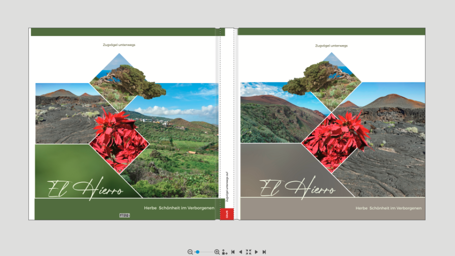 gefühlt habe ich jede Variante mit jedem meiner Fotos ausprobiert Vielleicht ist mein Problem auch, dass grün nicht wirklich meine Farbe ist, ich mag es lieber blau oder dann eben diese vulkanische Kargheit. Ich hab mal schlampig neue Varianten probiert, deshalb sind die Objekte auf der Seite nicht ausgerichtet. Hab einfach mal das Cover auf die Rückseite gezogen, damit man beide Varianten gegenüber sieht. Und nochmals an dieser Stelle Danke an alle und insbesondere an dich Spica. Der Austausch hier und die kritischen Augen sind immens wichtig! Re: Cover El HierroOk. Jetzt bin ich überfordert von so vielen schrägen Bildkanten und Rauten ...