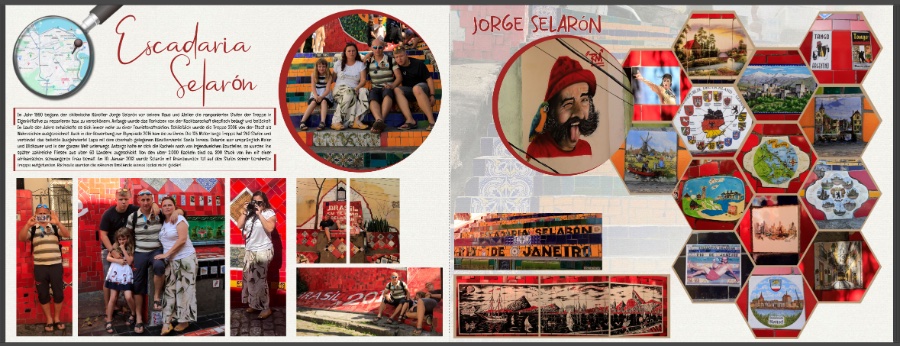 Hallo Isabell,ja es ist die Treppe von Selaron. Die unterschiedlichen Formen in den Sechsecken stammen von den unterschiedlichen Fliesen. Daher ist es halt schwierig diese gleichmäßig unter zu bringen. ... sondern die einzelnen Fliesen. Vielleicht muss ich auch das störende drum herum weg kopieren. Na mal schauen. Grüße Isabel ich könnte mir eine Doppelseite wie folgt vorstellen, wenn Du das Layout mit dem Kreis und den Sechsecken behalten möchtest: Auf der linken Seite 5 Sechsecke mit dem großen Runden und auf der rechten Seite ein großes Foto von der Treppe. Du schreibst: Vielleicht muss ich auch das störende drum herum weg kopieren. Versuche es doch erst einmal mit dem Zoomen. Hab ich bei meinem genannten Beispiel auch gemacht. Von den 15 Fotos findest Du bestimmt 6 gute. Für das große runde würde ich versuchen das Schönste davon zu nehmen. Macht m.E. auch nichts, wenn nur ein Ausschnitt und nicht die ganze Fliese zu sehen ist. Vielleicht wäre es auch eine Möglichkeit, die Fotos in Quadrate anzuordnen und zu drehen, wie es auf der Treppe sichtbar ist. Oder verzichte auf die Sechsecke und mach es wie Spica vorgeschlagen hat. Liebe Grüße Asiafan