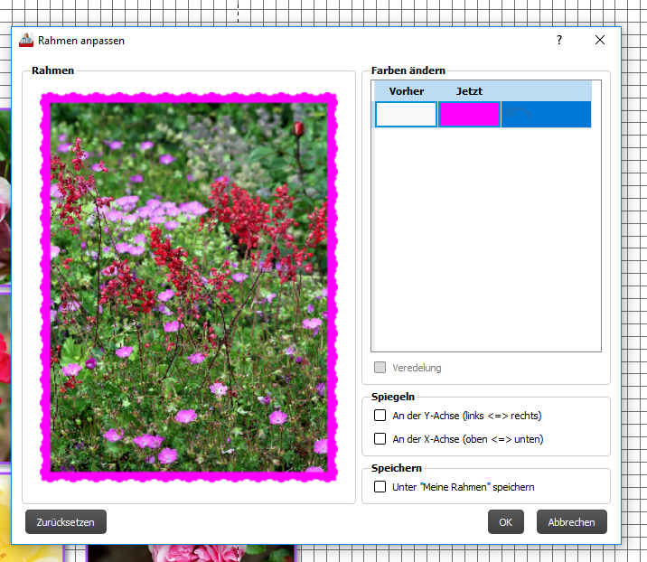 Ich habe Deinen Rahmen nicht gefunden.Aber die Farbe ändert man (normalerweise) einfach so: Das Bild mit Rahmen markieren, rechte Maustaste, Option "bearbeiten" auswählen, Option "Rahmen bearbeiten" anklicken und im nächsten Befehlsdialog die Farbe wie gewünscht eingeben. Das Cover gefällt mir jetzt viel besser. Ich würde allerdings Minna und Karl auf der Vorderseite (richtigherum) platzieren. Lieber Gruß, pitty
