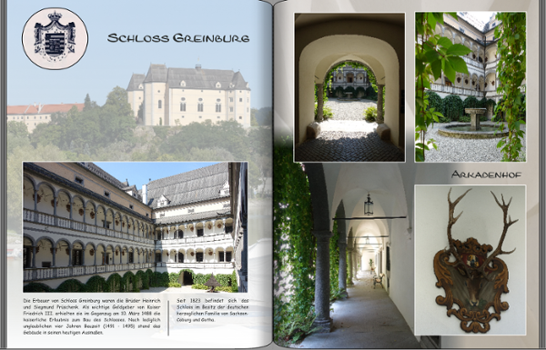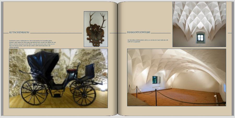 Re: Schloss Greinburg - wie gestalten?pitty hat geschrieben: Noch ein kleiner Vorschlag: Die Textblöcke Kutschenraum und Diamantgewölbe würde ich auf die selbe Höhe bringen. Hallo pitty, die Textblöcke sind in gleicher Höhe bei der Überschrift, würdest du die unteren Zeilen angleichen und zwischen Überschrift und Textanfang Leerzeilen setzen? pitty hat geschrieben: Viel wesentlicher ist aber, dass wir fast überall mit querformatigen Bildern konfrontiert werden (Landschaft, Fernseh- und Computerbildschirme, Kinoleinwand...). Diese Eindrücke in Hochkantbüchern zu präsentieren ist tatsächlich schwierig.