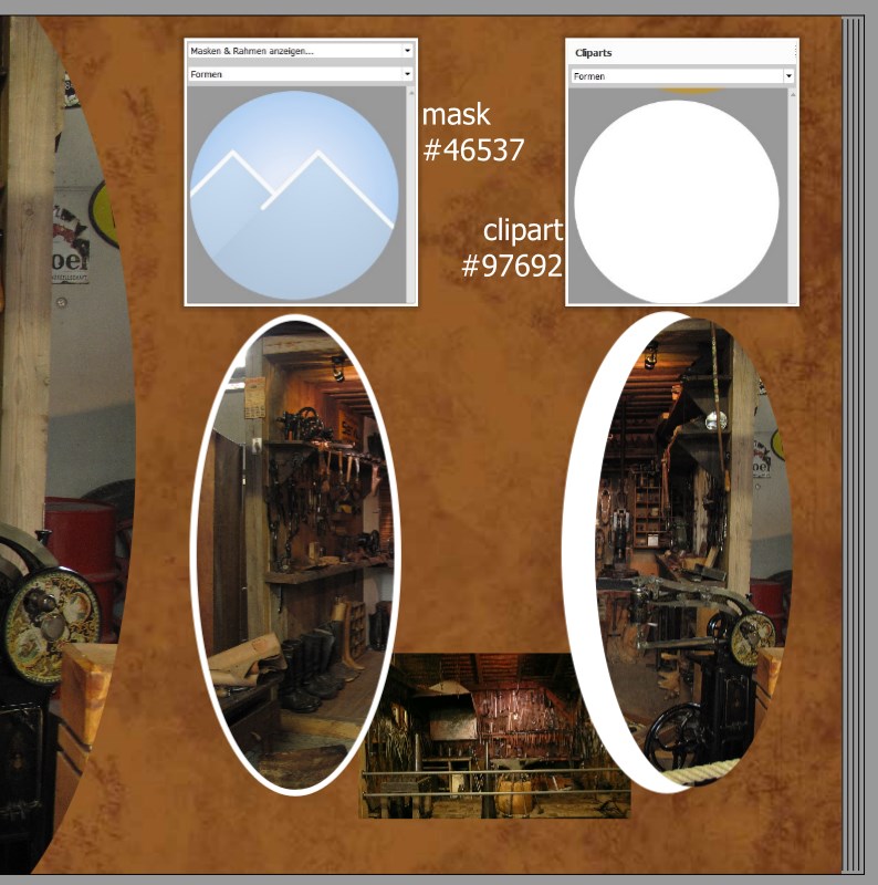 Lis Re: How is this made?This could be made from two high and narrow pictures with the round mask, two white, round cliparts, a little bit bigger than the pictures. In the middle two pictures set in the background.