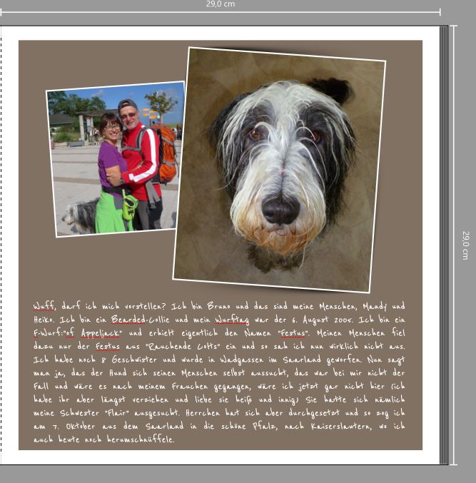 Wir laden Sie herzlich ein, die neue CEWE Community mit integriertem Forum zu entdecken und künftig zu nutzen. Das bisherige Forum, in dem Sie sich gerade befinden, steht nur noch bis Ende 2025 für neue Beiträge zur Verfügung und wird ab dem kommenden Jahr 2026 nur noch lesend zugänglich sein. Informieren und registrieren Sie sich jetzt in der neuen CEWE Community – wir freuen uns auf Sie! BrunoHeute Morgen beim bürsten unseres Hundes, kam mir die Idee, ein Buch von ihm mit seiner Sicht der Dinge zu erstellen. Viele Bücher werden erst nach dem Tod des Haustieres erstellt, das will ich nicht. Er wird dieses Jahre 13 Jahre und hat viel zu erzählen. Ich habe tausend Gedanken und Ideen im Kopf, die ich schon Stichpunktartig aufgeschrieben habe. Nun faszinieren mich ja seit neuesten die sogenannten "Weißen Bücher" die ohne viel Schnickschnack auskommen, hmmmm, das ist gar nicht so einfach