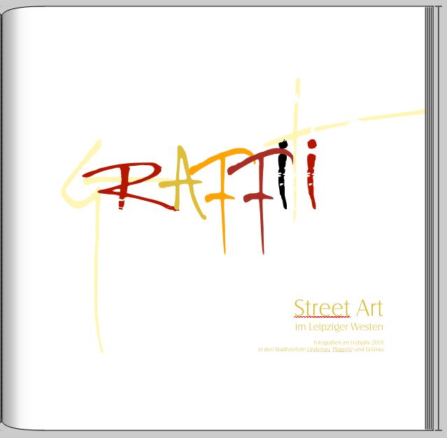 ... Zur Seite 2/3 (erste Innenseite): ... Ich finde, dass die Vollflächigkeit und die transparenten Bilder nicht so recht zu den anderen Seiten, die du zeigst, passen. Vielleicht würden weniger Bilder (nur Straßenbilder) und statt der Transparenzen kleinere Farbflächen auch gehen. Ich habe auf meinen Streifzügen außer Graffiti auch noch weitere "Straßenkunst" entdeckt, die ich gern ins Fotobuch mit aufnehmen würde. Wie ich das platziere, weiß ich aber noch nicht. Hängt von der Menge der gesammelten Werke ab; ich bin ja noch unterwegs und muss aufpassen, dass es ein GRAFFITI-Buch bleibt und kein Stadtviertelportrait wird (dann muss ich nämlich das Cover wieder ändern... Die Idee mit den Farbflächen gefällt mir tatsächlich besser. Entspannt die Seite. Liebe Grüße