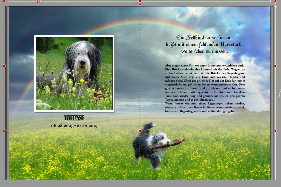 Ich habe zwei verschiedene Hintergründe ineinander verlaufen lassen und den Bruno auf der Wiese, der ist aus einem anderen Bild ausgeschnitten und auf die Wiese gesetzt, was verdeutlichen soll, wieviel Freude er dort wo er jetzt ist, hat... D:cry: das größere Bild habe ich durch ein Outdoorbild ersetzt. Die Schrift habe ich geändert und der Textblock ist nun auch genauso groß wie das Bild auf der anderen Seite, beides habe ich mittig ausgerichtet. Nur die Textfarbe ist nach wie vor schwarz. Ich habe verschiedene Farben probiert, aber irgendwie passt schwarz am Besten (?).