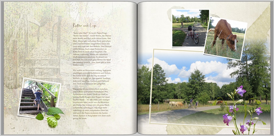 gleichfalls vom Scrapbook-Fieber infiziert, möchte ich gern meine ersten gestalteten Seiten zum Spreewald mit der Bitte um Feedback hier einstellen. Mir geht es ein bisschen wie Hellen und Mohkr: Ob Rahmen und ein paar Cliparts tatsächlich den Namen Scrapbook verdienen, weiß ich nicht. Bei mir sind es wohl ohnehin eher Tage- als Bilderbücher. Die Cover-Idee ist aus der Community-Galerie gemopst und meinem Buchstil angepasst. Der Flattersatz ist gewollt, wird aber noch angepasst, sodass er am Ende nicht ganz so flattert. Jegliche Ideen, Vorschläge, Anmerkungen sind willkommen. Ich freu mich drauf! Liebe Grüße