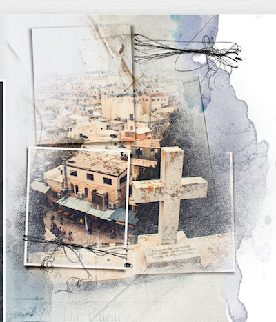 Re: Jerusalem im April“ – sonax10M.W. hat Sonax verschiedene Rahmen etc. z.B. bei oscraps gekauft. Aber diese Seite könnte man auch mit cewe erstellen. Auf ein Foto mit Verlauf legst Du 3 transparente Fotos mit unterschiedlichen Schatten und Rahmen. Unter/über das Foto stark transparente unregelmäßige Cliparts z.B. aus Formen. Die Schnüre gibt es bei cewe nicht, ließen sich aber im www oder vielleicht auch über philis Scrapbookfibel finden.