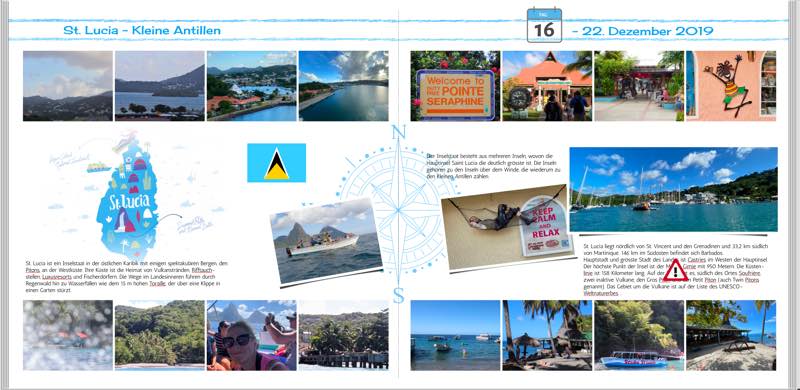 Ja die Linien sind im Moment schon noch recht dominant und du hast auch recht, dass sich der Reisetag nicht genügend vom Datum abhebt. Vielleicht spiele ich da noch ein bisschen mit 2 verschiedenen Fonts. Habe leider gerade gemerkt das ich die Linien nicht schmäler machen kann. Ich bin schon auf dem Minimum von 0.3cm. Eventuell müsste ich mit da was schlankeres suchen. Ich habe ich im Moment eher auf die Seite mit Fotos konzentriert und noch nicht unbedingt die Feinheiten wie zBsp. die Linien. Auch habe ich noch Korrektur Bedarf bei dem Text welcher über dem Kompass liegt. Der ist teilweise relativ schlecht lesbar und wenn ich den Kompass mit viel Transparenz versehe, habe ich das Gefühl dass er irgendwie nicht mehr richtig wahrgenommen wird. Gruss