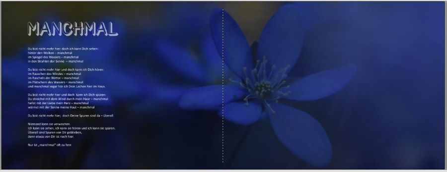 mir gefällt auch das zweite Motiv besser – wie in deinem ersten Entwurf gespiegelt, in der Helligkeit würde ich es zwischen dem ersten und zweiten Entwurf sehen. Der Text gefällt mir in der ersten Version (blaue Blume) viel besser. Die "manchmal" untereinander der zweiten Version sehen so nach Marschkolonne aus liebe Grüße