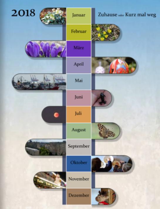deinen Einwand, dass die Punkte nach Haltestelle einer U-Bahn etc. aussehen, finde ich sehr berechtigt. Vielleicht findest du eine andere Clipart-Form (ein Fähnchen o.ä.), die du anstelle der Punkte verwenden kannst. Außerdem erschließt sich mir auf Anhieb nicht, warum du verschiedene Farben verwendet hast. So wie ich dich kenne, hat das sicherlich einen tieferen Sinn, der aber Außenstehenden nicht deutlich wird. Für mein Jahrbuch 2018 hatte ich eine vertikale Gestaltung der Monate in unterschiedlichen Farben entworfen. Etwas in der Art könnte ich mir auch gut für einen Reiseverlauf vorstellen. Lieber Gruß Traumfänger Re: Reiseverlauf vertikalDankeschön an alle fürs Zeigen und Gedanken machen.