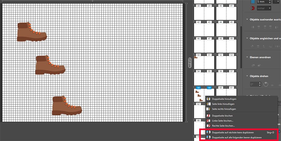 Wenn du Cliparts auf mehren Seiten verwenden möchtest, kannst du sie markieren, kopieren und auf die entsprechenden Seiten einfügen. Wenn die Cliparts auf alle oder auf die meisten folgenden Seiten kopiert werden sollen, kannst du auf der Seiten-Vorschau-Leiste mit der rechten Maustaste auf die entsprechende Seite mit den Cliparts klicken und auf die nächste oder auf alle folgenden leeren Doppelseiten duplizieren. Dort, wo sie nicht auftauchen sollen, einfach wieder löschen.