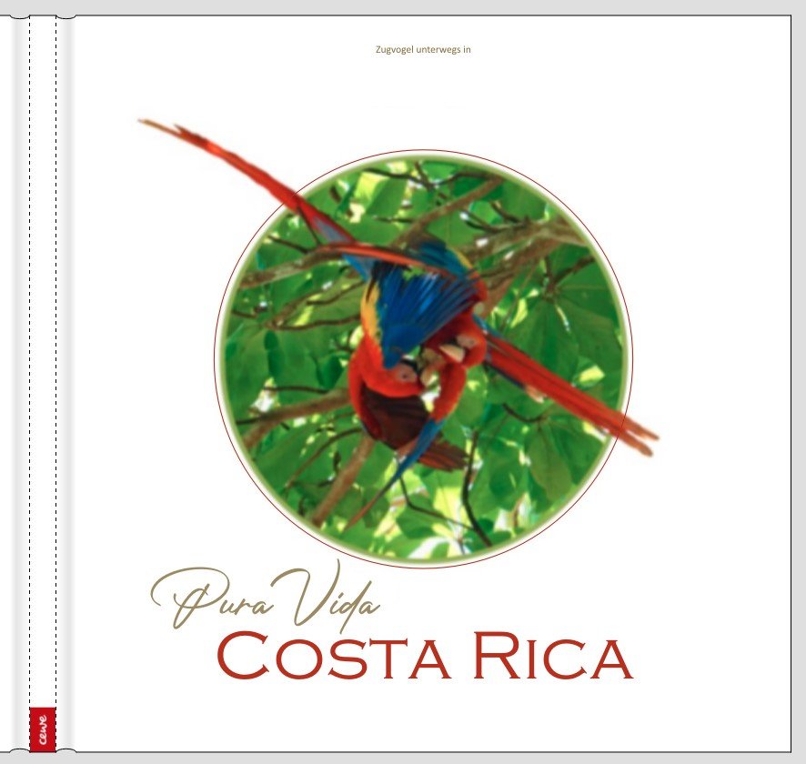 Monikas Überlegungen folgend, würde ich "Zugvogel ...", Kreis-Foto und "Costa Rica" vertikal auf dem Deckblatt zentrieren. Statt des etwas fetten grünen Farbrandes würde ich einen zarteren Farbrand mit Abstand in der Farbe der überstehenden Flügel wählen. Den Titel würde ich im selben Rotton gestalten. Die Farbe für "Zugvogel ..." und "Pura ..." habe ich aus den Zweigen gepickt. Die Farben für die Schriften würde ich in jedem Fall eher ähnlich als allzu konträr wählen, damit der Fokus auf den schnäbelnden Vögeln bleibt.