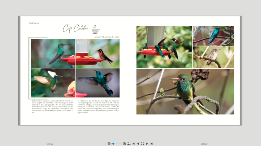 ich hab ganz viele Kolibris in Costa Rica fotografiert habe insgesamt 3 Doppelseiten mit Kolibris geplant (und ja, das ist für diejenigen, die sich nicht für Vögel interessieren, zu viel, aber für mich als Vogelfan nicht - hab eh schon aussortiert...)Bei der ersten Doppelseite bin ich mir aber nicht sicher, wie ich sei am besten gestalten soll. Es sollen natürlich wieder Infos über die Vögel rein, also brauche ich Platz für Text, andererseits sind die Hintergründe in den Fotos teils recht unterschiedlich, so dass es schwierig ist, die Fotos passend anzuordnen, zumal einige in den Büschen und andere an den Tränken saßen. Ich hab mal zwei Versuche rangehängt, die Texte sind noch nicht richtig ausgerichtet. Re: Kolibri-SeiteHallo Reisetante,