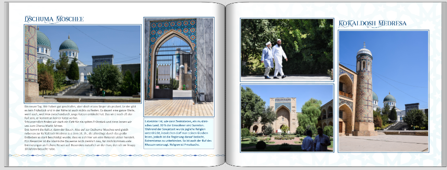 Mit meinem neuen Projekt bin ich so auf Halbzeit. Genug, um sich ein paar Gedanken zu machen, ob es passt oder nicht. Irgendwie hänge ich grad wieder fest. Selbst ist man ja nun schon soweit im Buch, dass es nicht schadet, wenn mal ein paar neutrale Augen auf das Werk schauen. Mein Stil soll nach wie vor eher klar bleiben, das Land (Usbekistan) gibt aber schon etwas mehr her. Ich habe nun extern einen Hintergrund gefunden, der zum Baustil passt. Ist das zu dominant? Ich habe immer mal wieder Verlaufsmasken drauf gelegt. Die Farben des Landes sind alle Blau-Töre und viel Gold, je nach Region aber auch Lehm. Was will ich ausdrücken? Die Schönheit des Landes und der Gebäude. Aber natürlich auch unsere persönlichen Erlebnisse. Die Textfelder sind unterchiedlich, ob Bericht oder Information. Die Infos will ich wieder als Blocksatz machen, das mache ich aber erst, wenn die Gestaltung steht. Auf einer Seite habe ich mal probiert, ob goldenen Farbränder oder auch Farbfelder evtl. gefälliger sind als das Blau, hab da etwas ausprobiert. Ich bin gespannt, ob ich durch euch wieder in die Spur komme. LG und schon mal vielen Dank Monika