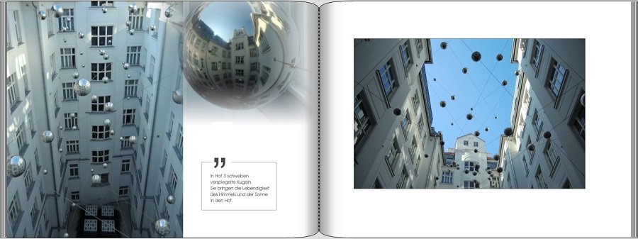 Das Motiv von Bild 8 (Kugeln im Innenhof) ist in Wien entstanden: Innenhof des Hotels "Motel One Wien-Staatsoper".