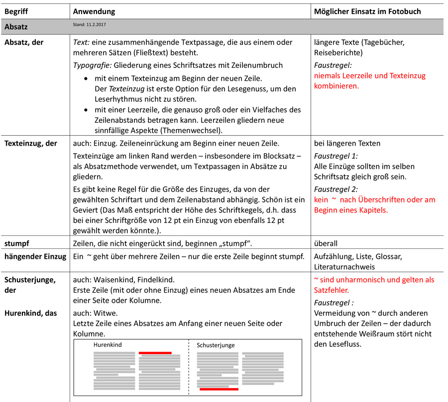 Re: Typografisches Glossarich habe mich von Josefias und philis tollen und hilfreichen Anwendungshandbüchern anstecken lassen. So habe ich Teile meines Typografischen Glossars als Fotobuch gestaltet und in eine pdf gedruckt. Im ersten Band geht es um die für Fotobuchgestalter wesentlichen Begriffe (Mikrotypografie). Der zweite Band (den ich noch nicht begonnen habe) wird sich im Wesentlichen um den optischen Gesamtkomplex des Layouts (Makrotypografie) drehen. Den ersten Band könnt Ihr herunterladen: https://www.dropbox.com/s/9gu5mseqzjse8 ... 7.pdf?dl=0 Ich hoffe, dass es klappt! Wenn Ihr die Seiten auf DIN A3 ausdruckt, entsprechen sie fast der Originalgröße. Den Informationsrand von cewe bzw. von der pdf-Software könnt Ihr abschneiden oder einfach „weggucken“. Ich plane, das Buch drucken zu lassen. Ich freue mich, wenn Ihr den Inhalt lektoriert. D.h., wer Fragen hat, Fehler oder Ungereimtheiten findet, der möge sich ausdrücklich aufgerufen fühlen, mir diese zu stellen bzw. mitzuteilen. Am liebsten hier im Beitrag: Fragen zum typografischen Glossar: viewtopic.php?p=109560#p109560 Lieber Gruß, pitty