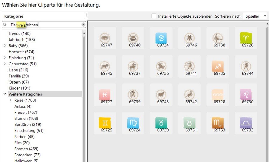 In der Version 7.1.4 ist es möglich, Cliparts, Masken und Rahmen gezielter suchen und finden zu können. Die Schlagwortsuche macht es möglich. Momentan funktioniert das allerdings nur mit dem Suchfeld, welches bei "Mehr herunterladen" angezeigt wird und ursprünglich nur das Eingeben einer Objektnummer vorsieht. Hier kann man nun ein Schlagwort oder Bestandteile eines Schlagwortes eingeben. Es werden dann alle Schlagwörter angezeigt, die das Suchwort enthalten (Bei Eingabe von "Kreis" stehen zum Beispiel auch "Halbkreis" , "Kreisring" und "Tierkreiszeichen" zur Auswahl).