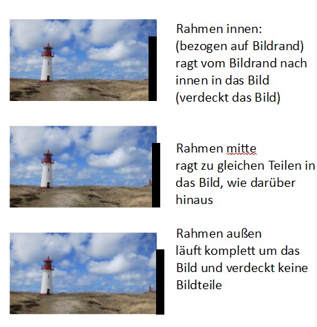Du hast recht, der Rahmen läuft immer außen um das Bild. Habe hier mal überzeichnet dargestellt, wie die Funktionen "innen, mitte, außen" zu interpretieren sind. Habe nur einen "Teilrahmen" dargestellt, damit man den Effekt im Vergleich sieht. Gruß DSL-schnell
