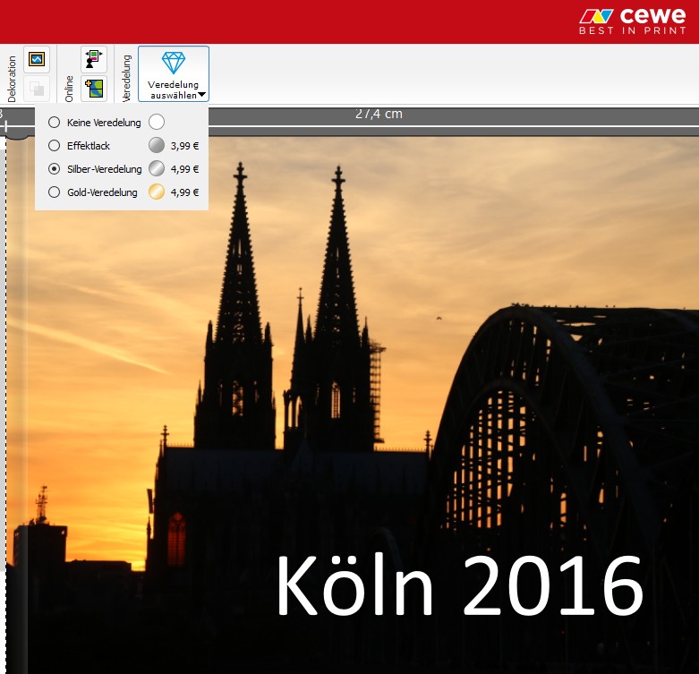 Bei mehreren sich überschneidenden Cliparts wird immer dasjenige Clipart veredelt, welches auf der oberen Ebene liegt. Ein Text, der als veredelt markiert ist, kann deshalb auch die Verdelung von darunterliegenden Cliparts verhindern. Re: Verfügbarkeit Fotobuch Gold- und SilberveredelungIch habe ein Fotobuch aus der Version 6.0.3 problemlos veredelt (ausgenommen die übereinander liegenden Objekte