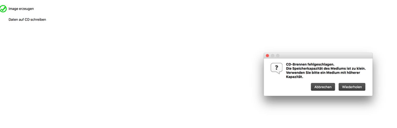 Ja die Version aus dem Forum habe ich installiert, soviel ich weiss gibt es doch noch keine 6.2 bei den Partner. CD brennen geht, da ich ja später die iso gebrannt hatte. Auch das Aufbereiten funktioniert ohne Probleme, aber dann wenn es um das Schreiben auf die CD ging, kommt die Meldung dass das Projekt zu gross sei und ich solle doch bitte ein entsprechendes Medium einlegen. Ich benutze auch keine andere Brenner-Software als die vom MAC also sprich Finder. Angehängt 3 Screenshots über den Ablauf. Gruss