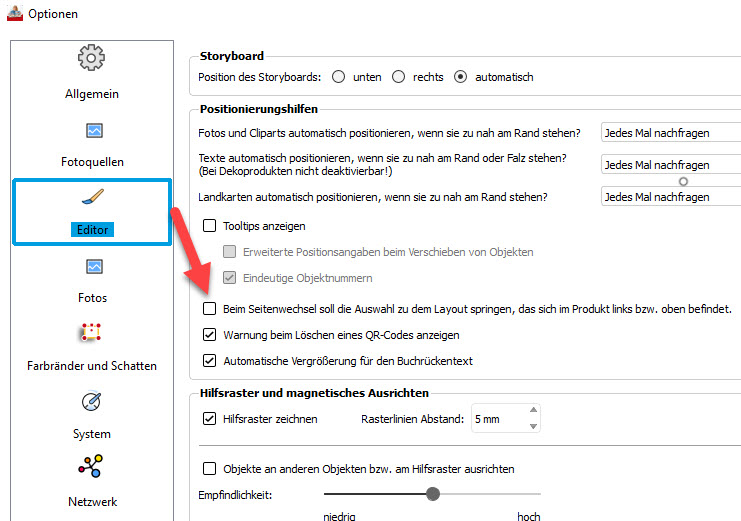dieser Haken ist der Haken. Bei mir war er gesetzt und als ich alle Einstellungen auf der Suche nach der Ursache meines Problems durchging, sah ich auch die Option "Beim Seitenwechsel soll die Auswahl zu dem Layout springen, das sich im Produkt links bzw.oben befindet." Da ich in meinem Produkt ausnahmslos alle Seiten als "Vollflächig" belegt hatte, so wie von Rotuma beschrieben, bin ich natürlich nicht auf den absurden Gedanken gekommen, dass die Formulierung in keiner Weise der Reaktion des Programmes entsprechen könnte. Also wenn ich will, dass beim Seitenwechsel die Auswahl zu dem Layout springen soll, welches sich im Produkt links bzw. oben befindet, dass dann diese Einstellung keinesfalls aktiviert sein dürfe. Mit anderen Worten, ich muss dem Programm vermitteln, dass ich nicht will, was ich will. Danke allen, die versucht haben, mir zu helfen und ganz besonders Dir, Josefia. Dank Deiner Feststellung ist bei mir die cewe-Welt wieder in Ordnung. Ich gehe davon aus, dass der Verursacher dieses Übels von Dir informiert wird. MfG, kodela Mit freundlichem Gruß, kodela Betriebssystem: Windows 10 CEVE-Versionsnummer: 7.3.1 (x64)
