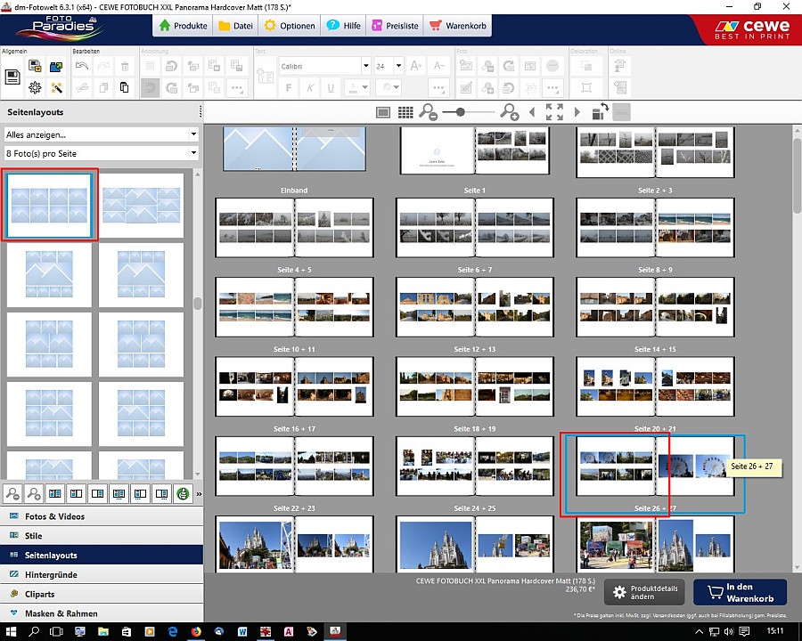 Das muss er nicht, wenn er wie beschrieben vorgeht. Lediglich für die hinzugefügten Seiten ist noch eine Anpassung erforderlich. hat geschrieben: Vorher habe ich mir das aber angeschaut und festgestellt, dass mein vorgegebenes Seitenlayout von 8 Fotos pro Seite genau auf den ersten 26 Seiten angewendet wird. Danach wird ein Standard-Layout verwendet.
