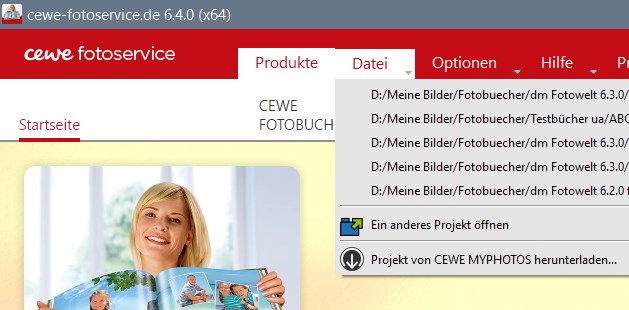 welche ist denn deine aktuelle Version? Das findest du oben in der Kopfzeile. Allerdings kann ich mich nicht erinnern, dass man ein neues Projekt über den Menüpunkt "Dateien" starten konnte. War deine vorherige Version schon sehr alt? In meinen aktuell installierten Versionen 3.2.1 bis 3.4.x kann ich diesen Menüpunkt auch nicht finden. Ich starte immer über "Produkte", "CEWE FOTOBUCH" und dann wähle ich das entsprechende Format usw., bis sich das leere Fotobuch öffnet. Das Datei-Menü sieht in allen meinen Versionen so aus: liebe Grüße