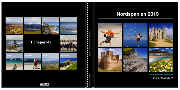 ich bin ja auch ein Fan von Cover-Mosaiken auf schwarzem Hintergrund. Zusätzlich zu den Optimierungstipps von DSL-schnell und pitty möchte ich noch anmerken, dass das genaue Datum des Urlaubsaufenthaltes auf Covern eher störend auf mich wirkt. Ich würde den genauen Zeitraum nur innen unterbringen und auf dem Cover allenfalls "Frühjahr 2019" schreiben. In dem Fall müßte es dann allerdings auch "Nordspanien" statt "Nordspanien 2019" heißen. Re: Schriftart und Schriftgröße CoverDas Datum auf dem Buchtitel ist sicher der Tatsache geschuldet, dass die gesamte Reise 9 Monate dauerte und das Fotobuch nur eben jenen erwähnten Zeitbereich beinhaltet. Wenn die ganze Reise durch Nordspanien führte, lässt sich das Datum auf dem Cover vielleicht auch gut durch "Band 1" oder "Teil 1" ersetzen und statt dessen nur auf den Schmutztitel verlegen.