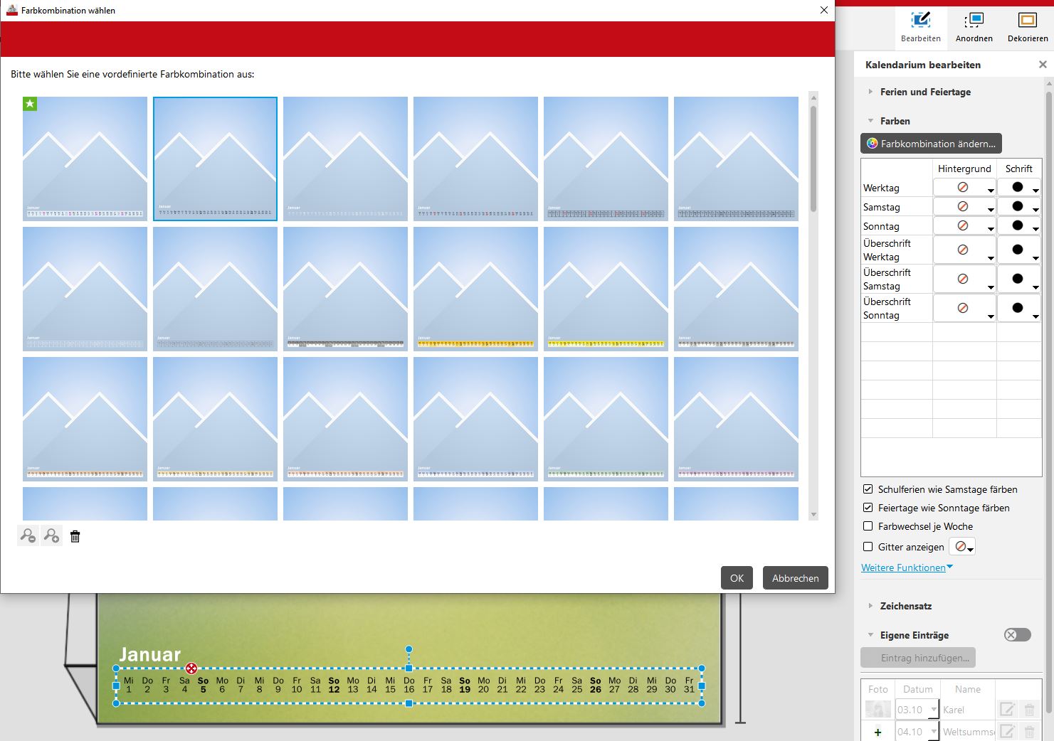 in der 7.0.1 gibt es eine Schaltfläche "Farbkombinationen ändern". Hiermit können noch andere Farbkombis genutzt werden, die keine Halbtransparenz drin haben. Du kannst es dir gerne einmal anschauen - Bereich Testing Um Verwirrungen zu vermeiden, die Version 7.0.1 befindet sich noch in der Entwicklung und ist noch nicht verfügbar. Sylke Re: Hintergrundfarbe des Kalendariums lässt sich nicht löschenAh, super, mir war gar nicht aufgefallen, dass diese Voreinstellungen, die wir ja von den früheren Versionen kennen, in der Version 7.0 fehlen. Gut, normalerweise bräuchte ich sie ja nicht