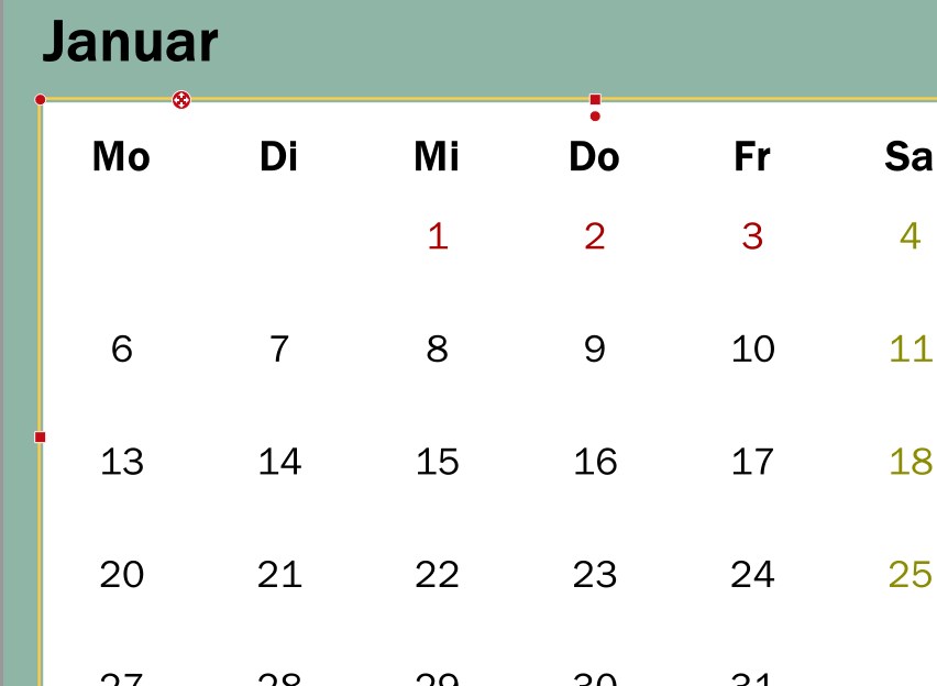 Feiertage haben bei mir die gleiche Farbe wie Sonntage, siehe 1. Januar. Die Textfelder aus der Vorlage habe ich weg geschoben und durch eigene ersetzt. Ich habe mit Feiertagen wie Rosenmontag oder Aschermittwoch nichts am Hut...