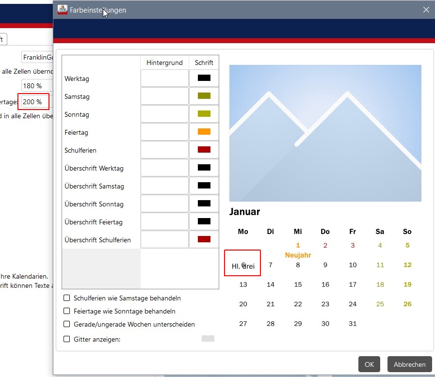 Hallo Josefia,Hast du die originären Monatsnamen durch eigene ersetzt? Feiertage haben bei mir die gleiche Farbe wie Sonntage, siehe 1. Januar. Die Textfelder aus der Vorlage habe ich weg geschoben und durch eigene ersetzt. Ich habe mit Feiertagen wie Rosenmontag oder Aschermittwoch nichts am Hut. --> werden aber als Fehler genannt. Das Bundesland ist korrekt eingestellt. Unklar ist mir, was abgeschnitten wird. Gruß Reisender Re: Fehlermeldung beim BestellenIch meinte auch die Feiertagsnamen, nicht das Datum, da hatte ich gesehen, dass es farblich angepasst ist.