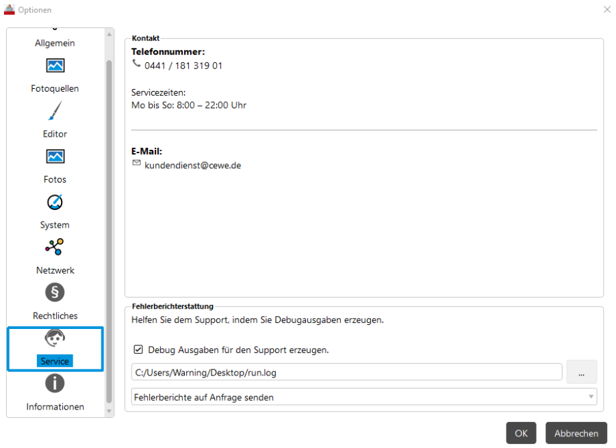herzlichen Willkommen in unserem Forum! Ich bedaure Ihre Probleme und versuche Ihnen bei Ihrem Anliegen behilflich zu sein. Darf ich Sie fragen, welche Version Sie installiert haben und welchen Zeitstempel diese trägt? Angaben zur Version finden in den Optionen unter "Informationen". Sie können gerne ein Screenshot erstellen und hier hochladen. Bleiben Sie in den Optionen und rufen Sie die Registerkarte "Service" auf. Setzen Sie bei "Debug Ausgaben für den Support erzeugen" einen Haken. Die Anwendung schreibt dann während Ihrer Arbeit mit der Software ein Logfile mit. Dieses wird lokal auf Ihrem Rechner gespeichert und kann uns bei der Fehlerfindung unterstützen. Des Weiteren empfehle ich die Einstellung "Fehlerbericht auf Anfrage senden" oder "Fehlerbericht immer senden". Dieser Bericht wird bei Freigabe direkt an unsere Entwicklung geschickt. Zusammen mit einem Logfile, welches Sie mir nach einem erneuten Absturz zusenden können, ist der Fehler sehr wahrscheinlich schnell gefunden. Sollten Sie die Version 7.1.0 installiert haben, so deinstallieren Sie diese bitte und laden Sie sich diese Version komplett neu herunter und installieren diese. Die Zusendung des Logfiles kann an die folgende Adresse erfolgen: Betreff: Regelmäßige Abstürze | User: Twixt Adresse: forum@cewe.de Sylke Re: Regelmäßige AbstürzeHallo Sylke,