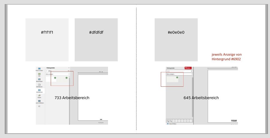 Versionsnummer: 7.3.3 Handelspartner: dm Beschreibung: Ich arbeite mit der Programmoberfläche "hell" und stolpere immer wieder darüber, dass helle Hintergründe oder Cliparts auf meinem Bildschirm nahezu unsichtbar sind. Hier zwei Beispiele: Suche nach Hintergrund 6902 Cliparts (Kategorie Hochzeit) Früher (bis Version 6.x (?)) gab es für die Programmoberfläche noch weitere Grauabstufungen zur Wahl. Würden diese wieder eingeführt, ließe sich das Problem der Unsichtbarkeit von hellen Objekten leicht auflösen. Alternativ kann ich mir für Hintergründe einen feinen Rahmen in der Anzeige vorstellen. Und für Cliparts einfach dunklere Farben als Standard im Downloadportal, da diese sich ja ohnehin beliebig umfärben lassen. Liebe Grüße