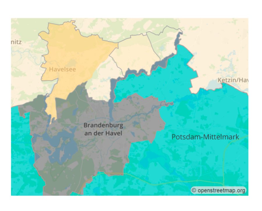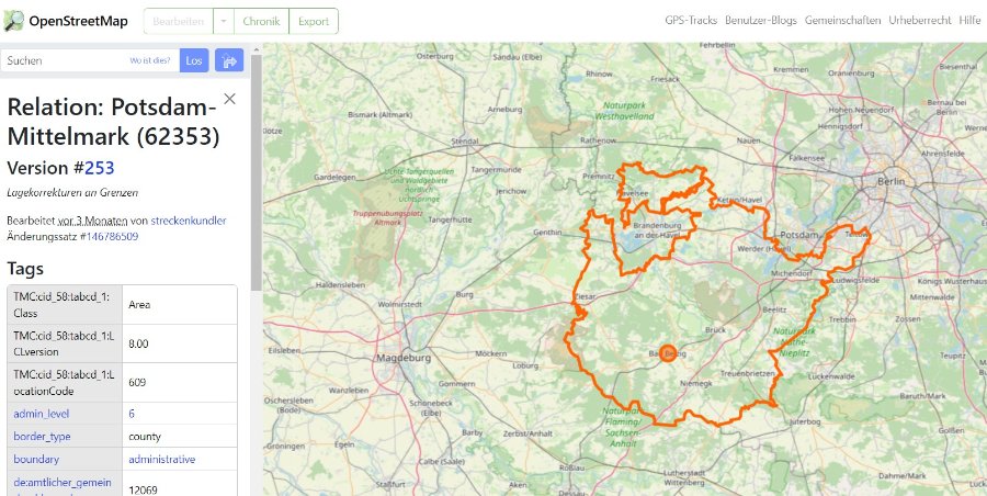wir haben eine Rückmeldung aus der Fachabteilung. Beides sind Exklaven, da sie durch die Havel von dem Großteil Potsdam-Mittelmarks getrennt sind. Dabei stellt sich natürlich die grundsätzliche Frage, ob Exklaven bei der Anwahl einer Region zu berücksichtigen sind. Nehmen wir Frankreich als Beispiel. Die meisten von uns erwarten, dass ausschließlich das in Europa liegende Frankreich markiert wird. Openstreetmap.org zählt aber auch hier die Exklaven dazu, sodass auch das in Südamerika liegende Gebiet Französisch-Guayana markiert wurde. So war es auch zuerst bei uns implementiert, was wie im Beispiel Frankreich zu unerwarteten Ergebnissen geführt hat. Wir haben uns daraufhin entschieden, diese Exklaven nicht weiter hinzufügen zu lassen. Die Methode von Spica ist eine ausgezeichnete Lösung. Wir bitten in diesem Sonderfall darauf zurückzugreifen und bitten um Verständnis. Viele Grüße