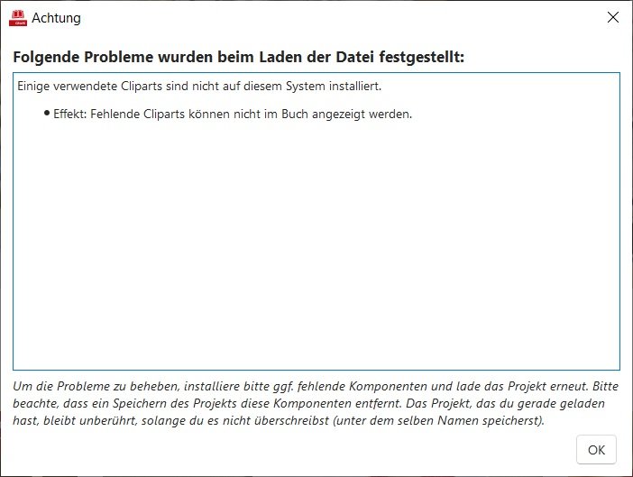 Versionsnummer: 8.0.2 Handelspartner: Rossmann Beschreibung: Ich bin noch bei meinem ersten Fotobuch und habe nun seit Tagen beim Öffnen des Projekts eine Meldung über fehlende Cliparts, allerdings ohne konkreten Hinweis auf Seite oder Objekte. Ich habe wissentlich keine Cliparts verwendet, ich hab sie lediglich mal geöffnet und durch gescrollt, um zu sehen, was drin ist. Nach dem Öffnen des Projekts kann ich auch nichts erkennen, was unvollständig wäre, es fehlt scheinbar nichts. Trotzdem bleibt auch nach erneutem Abspeichern die Meldung. Vielleicht noch etwas früh, aber trotzdem: Frohe Weihnachten an alle, die hier lesen und vor allem an alle, die hier unterstützen!